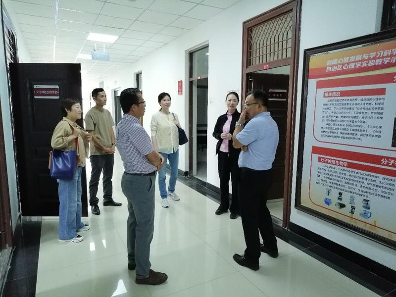 8月17日上午,乌鲁木齐市第四人民医院(新疆精神卫生中心)副院长何华、科教科副主任马晓洁、记忆门诊认知测评师吴丽珍、杨海博士来金年会心理学实验中心参观交流。何华副院长一行首先实地参观了心理学实验中心,详细了解实验中心的硬件设施、建设运行、成果产出、师资建设等相关情况。参观后双方座谈交流。金年会jinnianhuicom院长、自治区心智发展与学习科学重点实验室主任买合甫来提·坎吉、副主任马学海、安外尔·热合曼博士等参加座谈。买合甫来提·坎吉对何华一行的来访表示欢迎,并介绍了金年会jinnianhuicom及自治区心智发展与学习科学重点实验室的基本情况和研究方向以及合作需求。何华对实验中心致以感谢,介绍了双方可以开展合作的研究领域,并表示实验中心的建设将对两家单位的进一步深入合作搭建了良好的平台,将充分利用现有资源积极开展相关领域的合作,打造精神卫生领域的科研创新平台。双方科研人员畅所欲言,介绍了各自研究领域,表达了今后的合作意愿。经深入座谈会,双方在自治区重点实验室建设、研究团队建设、样品库建设、研究项目合作、师资培训、联合培养研究生以及定期召开研讨会制度等方面初步达成了合作意向。