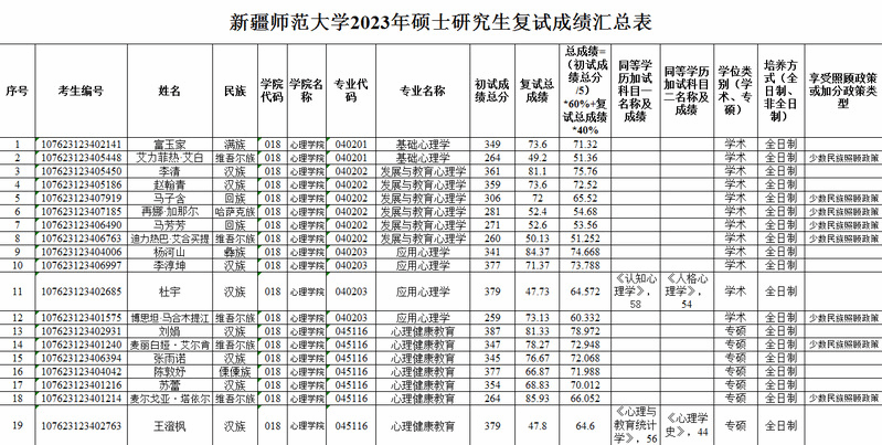 疆师范大学金年会jinnianhuicom2023年硕士研究生招生考试第一志愿复试工作已全部结束,现将成绩予以公示。如有异议,请联系研究生招生办公室。 电话: 0991-4110506 电子信箱:598161342@qq.com